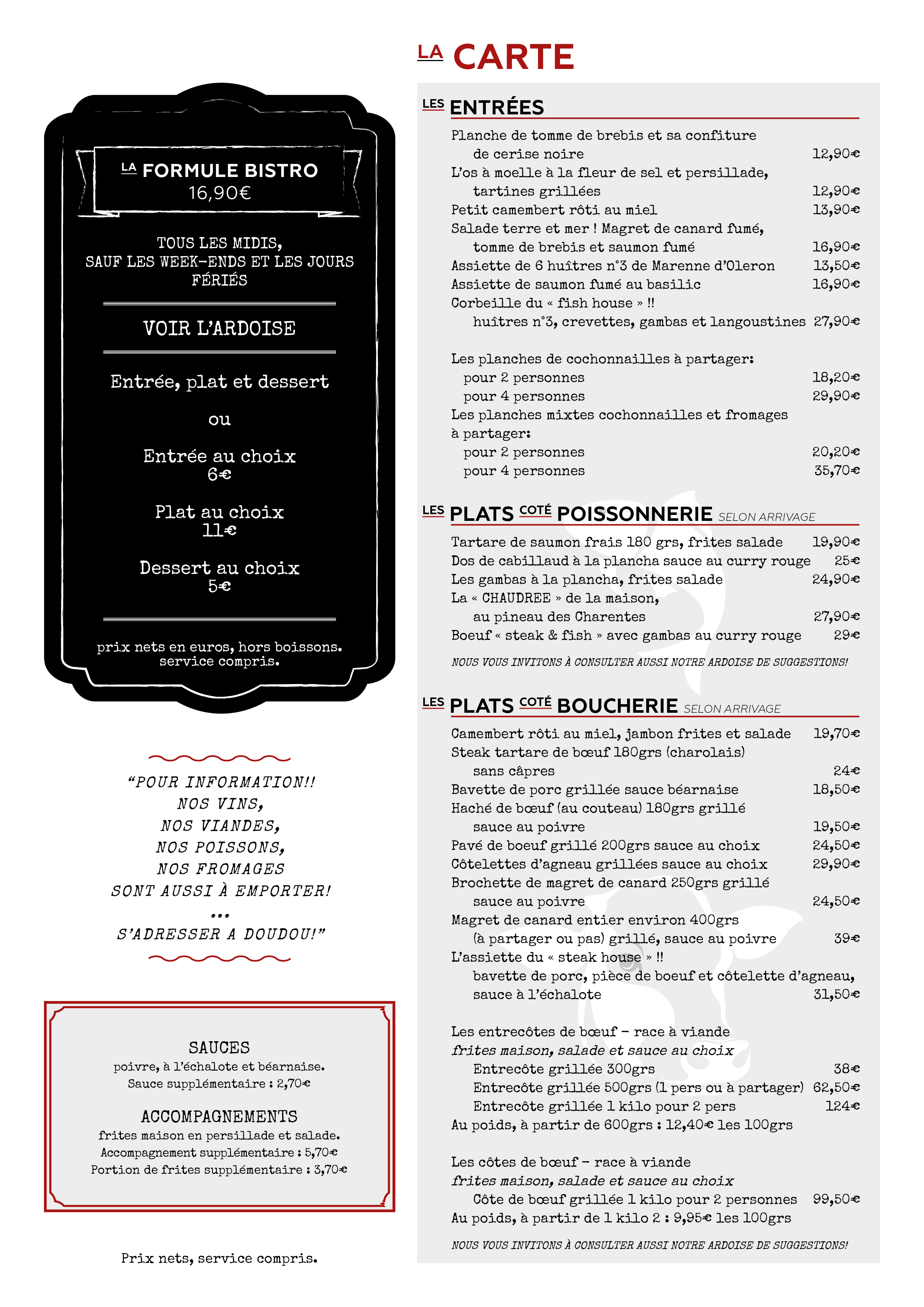 Yaya met tout en œuvre pour ravir vos papilles avec de la viande a race (blonde d’Aquitaine, black Angus, simmental, salers...) et maintenant sa nouvelle vitrine de la mer ( huitres,gambas,crevettes et langoustines ….pendants que Doudou se charge de vous proposer ses meilleurs desserts et une sélection de vins.